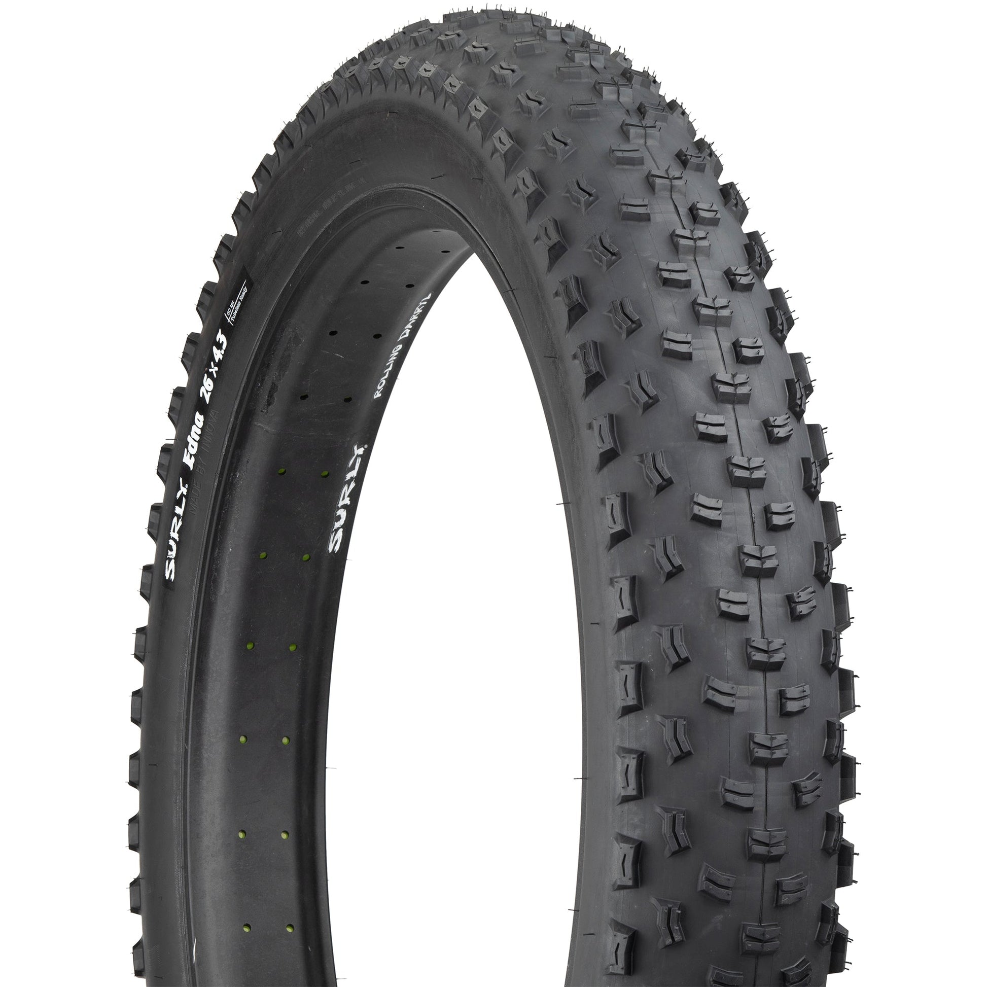 Meet Edna: our ultra-versatile fat bike tire. Edna is designed to perform admirably on a wide variety of terrains. Wanna go ride some super loose dirt or snow trails? Do it. Feel like riding over the pulverized bones of your enemies or, as some people call it, sand? Go for it. Hardpack? Lean back and let ‘er rip. Edna’s unique tread pattern has enough lug to provide bite on the loose stuff and a tight center tread that doesn’t drag on the hard stuff. Add in a 4.3” footprint and you have enough traction and float to ride wherever and whenever you damn well please.